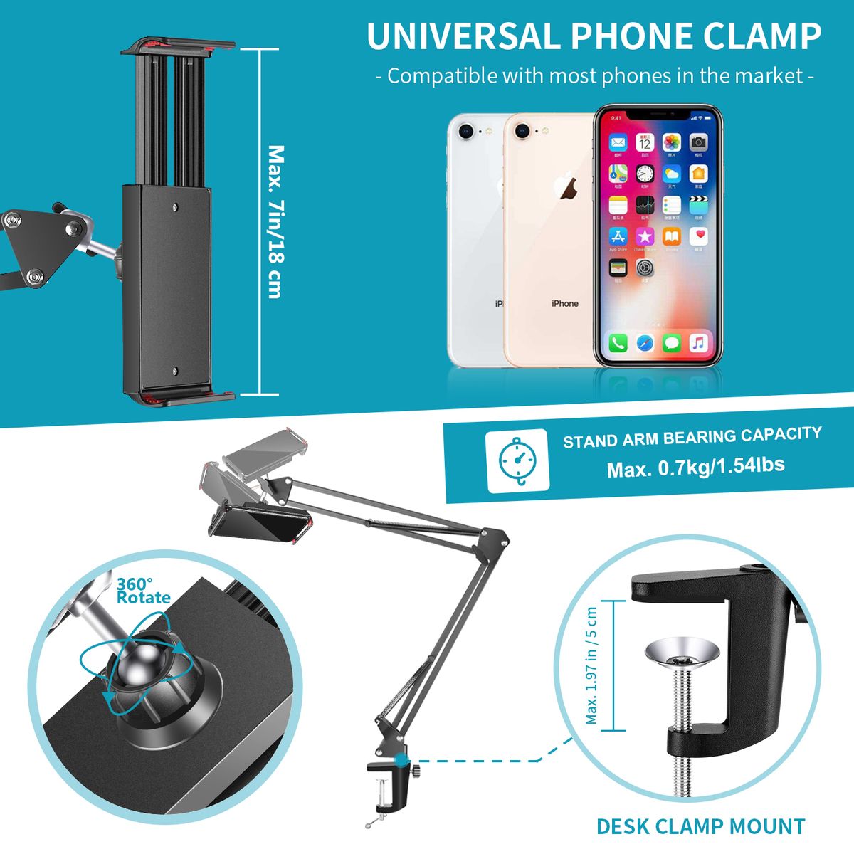 UNIVERSAL PHONE CLAMP: Compatible with most phone in the market with 4-7 inch/ 10.2-17.8 centimeters screens, such as iPhone 11 Pro Max, 11, XR, iPhone XS, iPhone XS Max, iPhone X, iphone 8, iphone 8 plus; Samsung Galaxy S9, S9+; Samsung Galaxy S8, S8+ plus; Google Nexus 7, Pixel, Pixel XL, Pixel XXL, Nexus 5, Nexus 4; Motorola, Sony, Huawei, HTC, LG, Nokia cell phone etc