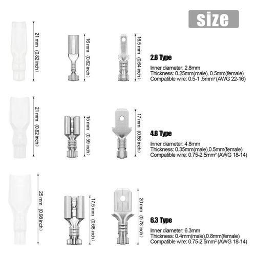 Packaging: This kit includes 2.8mm/4.8mm/6.3mm male and female crimp terminals.