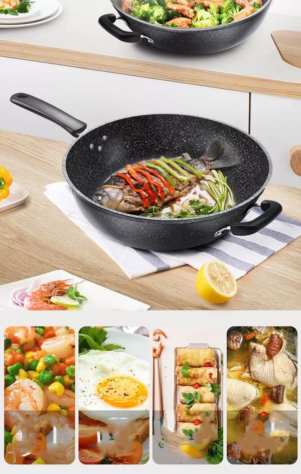 This fry pan is made from environmentally friendly, aluminum with a PFOA free non-stick surface. It is oven safe to 260°C with even heat distribution and unsurpassed durability, along with wooden spoon spatula for non stick pan and stire-fryAvailable in sizes 28cm to 34-stick surfaceOven safe cast aluminum for quick heat and even heat distributionContemporary satin finish trimsPFOA freeA high quality
