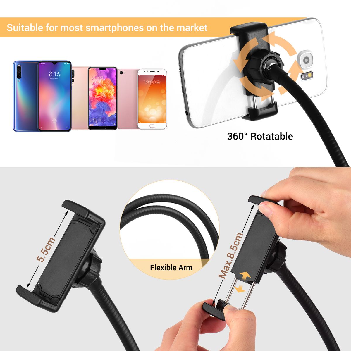 【Flexible Arms & Strong Clamp】 Flexible arm design, you can adjust the usage angle of ring light and smartphone freely; the strong metal clamp enables you to fix the bracket to desk steadily.