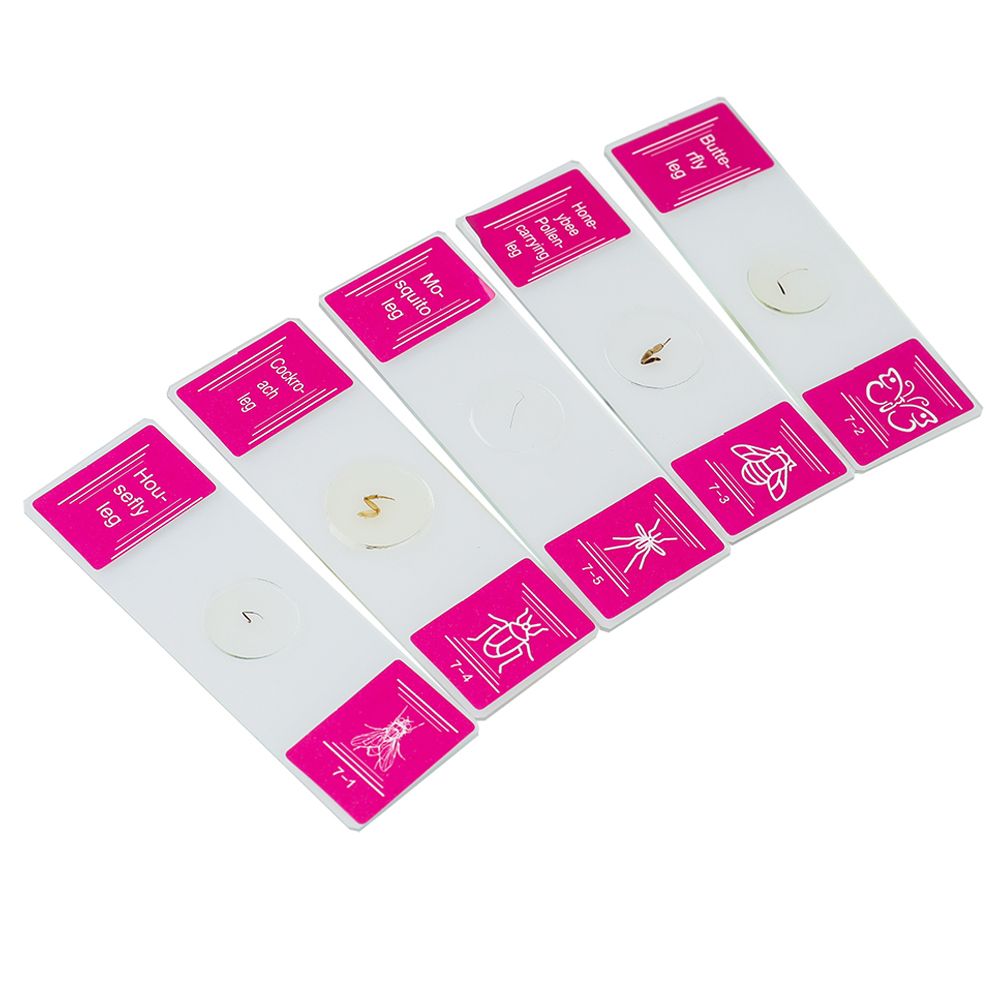7 types of slides, including cell, vegetabless, tissue, insect wing, stem, insect leg and verfluent.