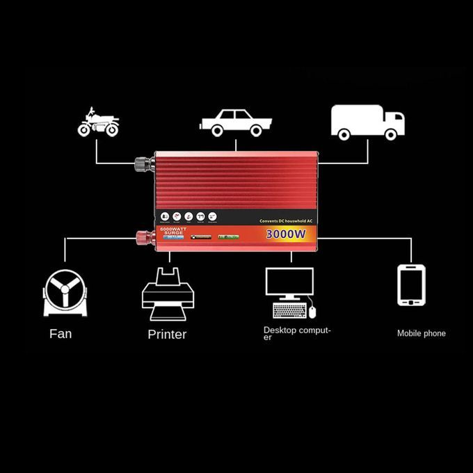Power inverter, product model: 3000W.Peak power: 3000W, rated power: 1500W, input voltage: 12V, 24V, 48V, 60V.Output voltage: 220V.Output frequency: 50Hz, no-load current 0.6A, conversion efficiency 90%.