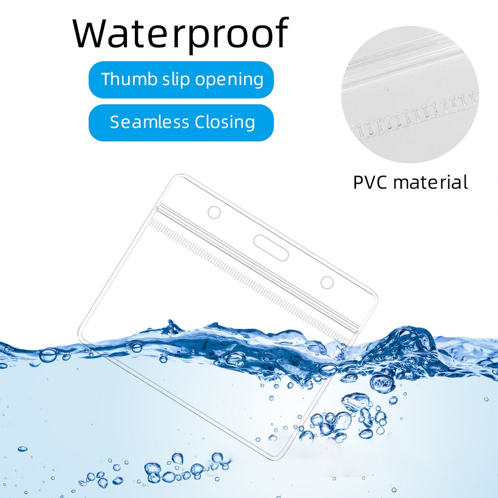 This thin but durable PVC material card protector keeps your document or valuable collector card from damage. Waterproof, seamless closing, thumb slip opening. 3 holes to attach to any lanyard. Widely used for people who need to travel, work, working persons of special or promotional events, conventions, etc.