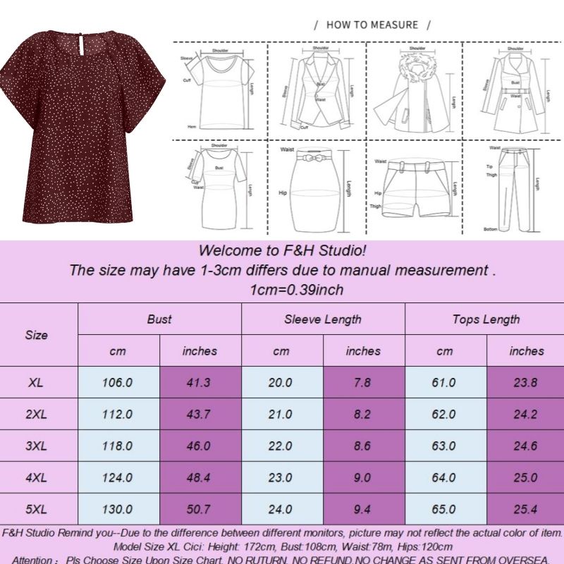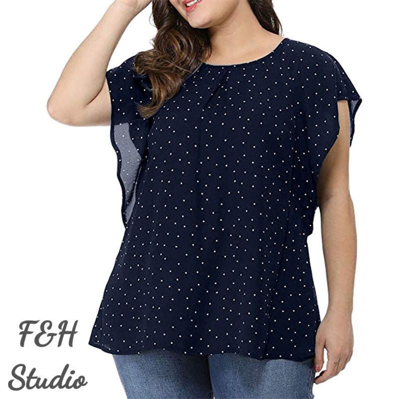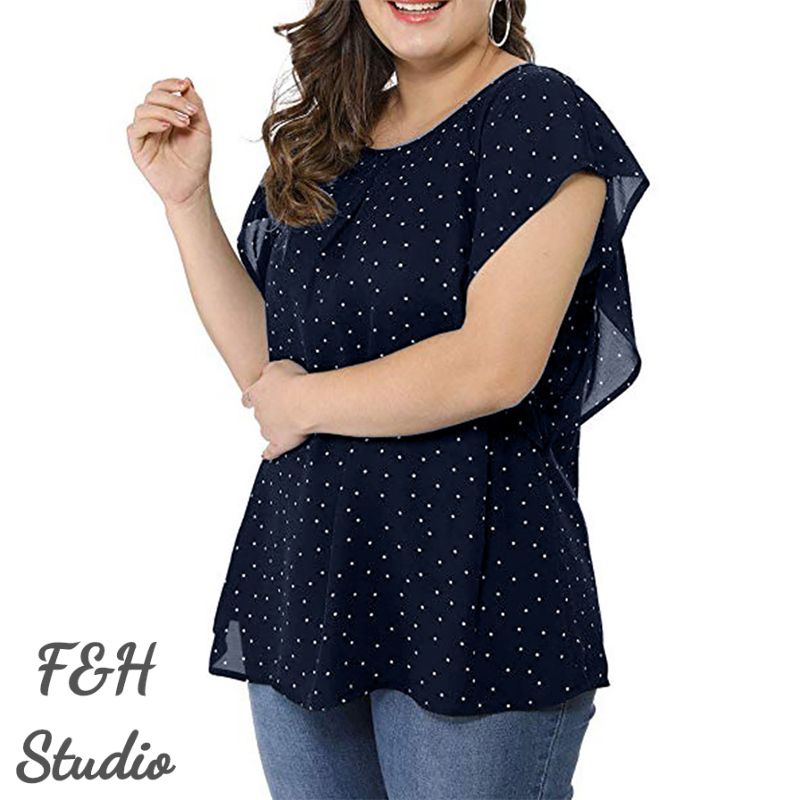 Color: Navy Blue Size: L,XL, 2XL, 3XL,4XL,5XL Model Size FYR: Model wear size XL ❤This is a round neck short sleeve big size tops plus size blouse !!❤Style:F&H 3564- L-5XL Summer Women Ruffle Sleeves Plus Size Polka Dot Blouse. Please note that slight color difference should be acceptable due to the light and screen.What You Get:1 x Blouse. FQA:1. Q: Why the item haven't shipped out? A: After you place the order, We will ship the item to the rehmie warehouse within 48 hours as soon as possible, and then rehmie warehouse will send the item to you. If you find the logistics status is"to be shipped", it may be because the rehmie warehouse has not yet been shipped. Please don't worry. 2. Q: How can I choose the size? A:Please refer to the size chart and select the appropriate size according to your actual size.If you are not sure what size to choose, please call me. 3. Pls take note that all the clothes can not be returned or exchanged.4. All dimensions are measured by hand, there will be 2-3cm reasonable deviations. (1cm=0.39 inches). Pictures are only samples for reference. Due to the differences in monitor settings, the colors shown in the photograph may not correspond 100% to those in the items themselves. 5.For transportation needs, the cloth that you've received will have a fold phenomenon. Please don't worry, this fold situation will disappear after the first time you clear or ironing.