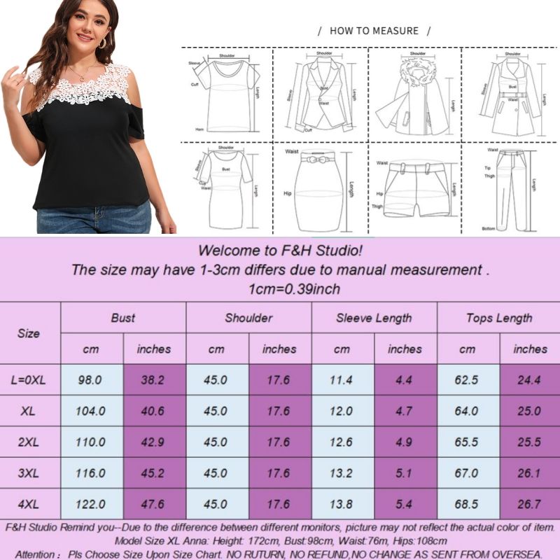 Color: Black Size: L,XL, 2XL, 3XL,4XL Model Size FYR: Model wear size XL ❤This is a short sleeve big size tops plus size blouse !!❤Style:F&H 3568-L-4XL Stylish Plus Size Women Short Sleeve Off Shoulder Tops. Please note that slight color difference should be acceptable due to the light and screen.What You Get:1 x Blouse. FQA:1. Q: Why the item haven't shipped out? A: After you place the order, We will ship the item to the rehmie warehouse within 48 hours as soon as possible, and then rehmie warehouse will send the item to you. If you find the logistics status is"to be shipped", it may be because the rehmie warehouse has not yet been shipped. Please don't worry. 2. Q: How can I choose the size? A:Please refer to the size chart and select the appropriate size according to your actual size.If you are not sure what size to choose, please call me. 3. Pls take note that all the clothes can not be returned or exchanged.4. All dimensions are measured by hand, there will be 2-3cm reasonable deviations. (1cm=0.39 inches). Pictures are only samples for reference. Due to the differences in monitor settings, the colors shown in the photograph may not correspond 100% to those in the items themselves. 5.For transportation needs, the cloth that you've received will have a fold phenomenon. Please don't worry, this fold situation will disappear after the first time you clear or ironing.