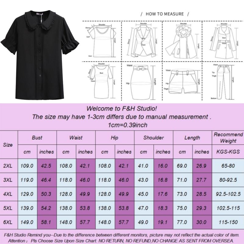 Color: Black Size: 2XL, 3XL,4XL,5XL,6XL M❤This is a short sleeve big size tops plus size blouse !!❤Style:F&H 3576-2 Colors 2XL-6XL Plus Size Women Chiffon Lantern Sleeve Blouse. Please note that slight color difference should be acceptable due to the light and screen.What You Get:1 x Blouse. FQA:1. Q: Why the item haven't shipped out? A: After you place the order, We will ship the item to the rehmie warehouse within 48 hours as soon as possible, and then rehmie warehouse will send the item to you. If you find the logistics status is"to be shipped", it may be because the rehmie warehouse has not yet been shipped. Please don't worry. 2. Q: How can I choose the size? A:Please refer to the size chart and select the appropriate size according to your actual size.If you are not sure what size to choose, please call me. 3. Pls take note that all the clothes can not be returned or exchanged.4. All dimensions are measured by hand, there will be 2-3cm reasonable deviations. (1cm=0.39 inches). Pictures are only samples for reference. Due to the differences in monitor settings, the colors shown in the photograph may not correspond 100% to those in the items themselves. 5.For transportation needs, the cloth that you've received will have a fold phenomenon. Please don't worry, this fold situation will disappear after the first time you clear or ironing.