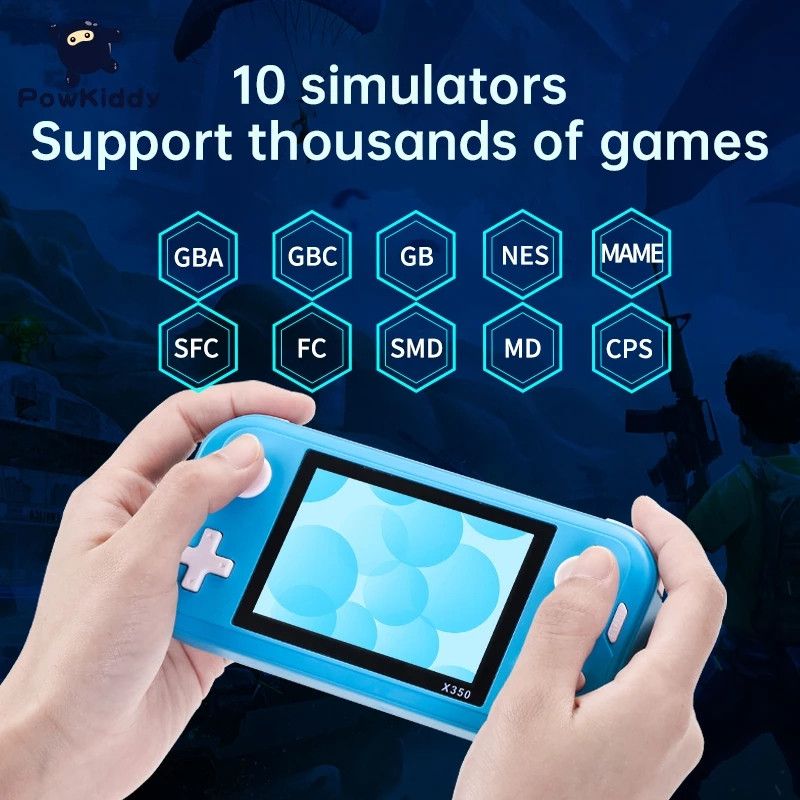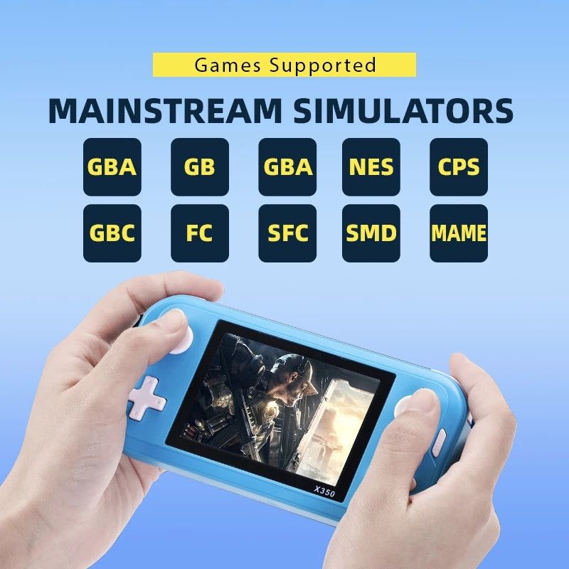 Portable handheld game console with 3.5 inch IPS screen, 800x480 resolution.