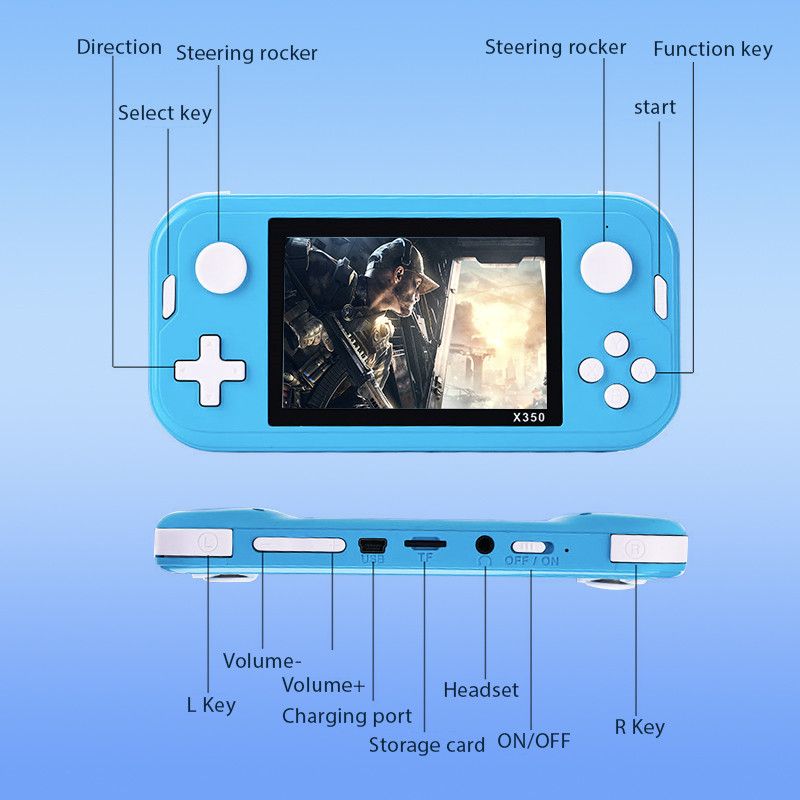 --Portable handheld game console with 3.5 inch IPS screen, 800x480 resolution.