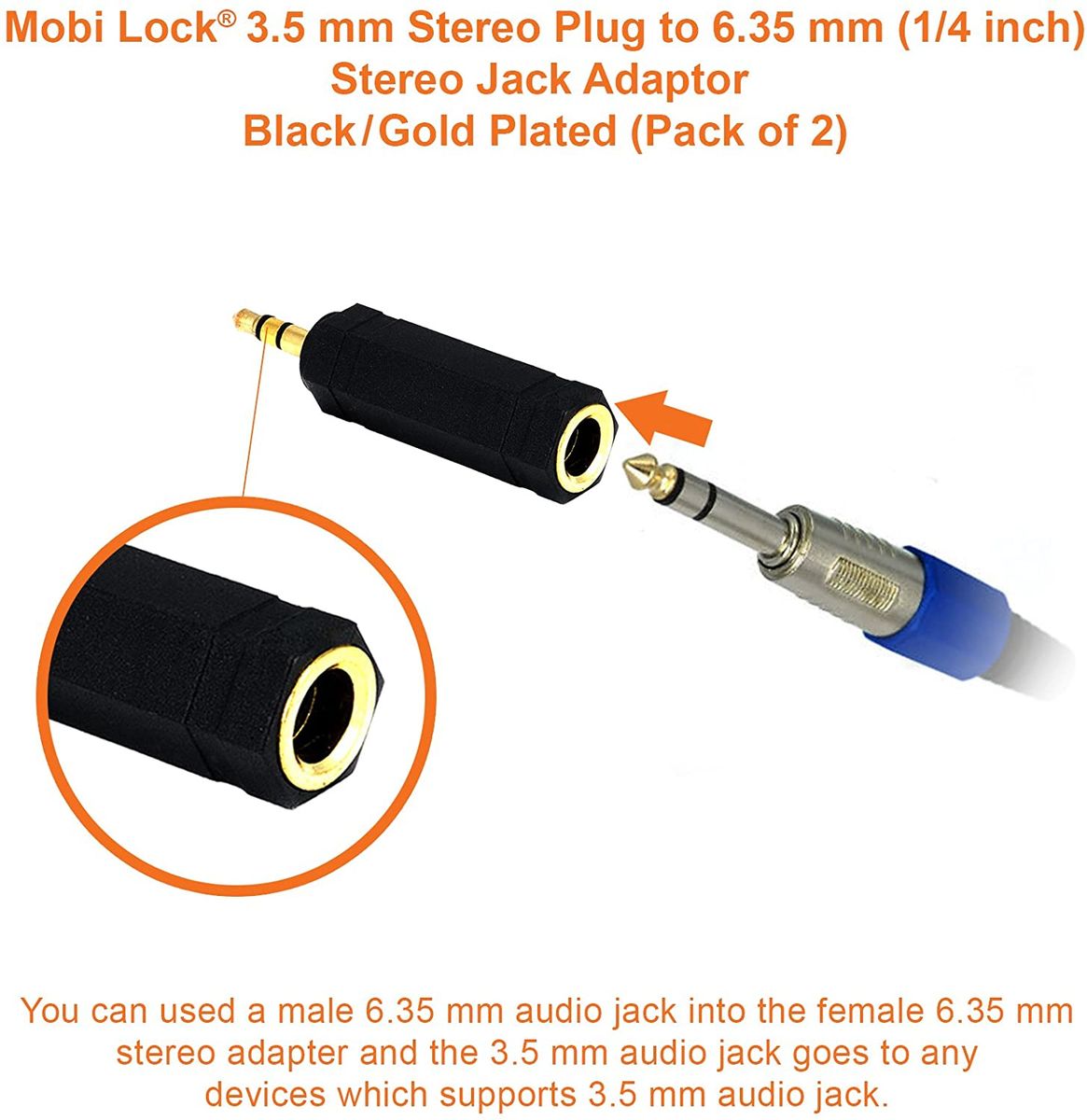 - ✅ Since Mobi Lock stereo audio cable male to female and the 3.5mm to 6.3mm adapter FITS IPHONE DEVICES, you can easily adapt a 3.5mm stereo plug to a 6.35mm plug, MAKING YOUR favorite HEADPHONES or AUDIO devices COMPATIBLE with most PRO AUDIO SPEAKERS and HOME AUDIO equipment. The 3.5mm adapter and this 1/8 inch to 6.3mm cable can connect to other devices such as amplifiers, mixing console, home theater devices, Guitar Headphone Recording Equipment and AV receivers with 6.35mm socket.