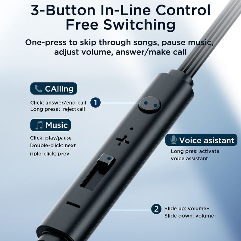 2. 3-on in-line control, free switching: One-press to skip through songs, pause music, adjust volume, answer/make call.