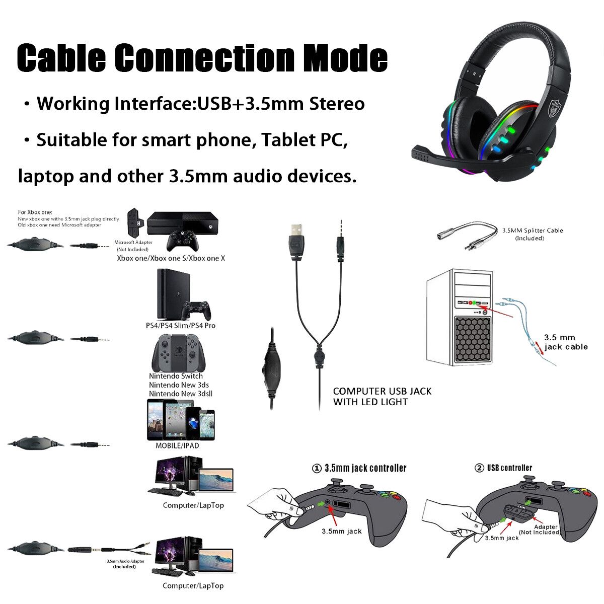 3.5mm Wired Gaming Headset PC Laptop RGB LED Gaming Headphones with Mic 27x21.5cm