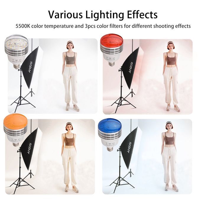 5500K color temperature, and come with color filters(red/yellow/blue) to create colorful lighting effects easily.