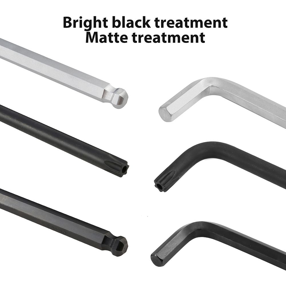 High Quality Surface Treatment: 13pcs (1.27-10mm) metric system with electroplating matte surface treatment, 13pcs (3/64-3/8inch) imperial system and 9pcs (T10-T50) star key with blackening surface treatment.