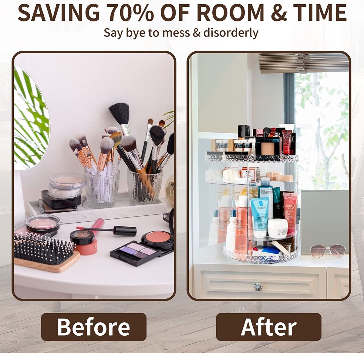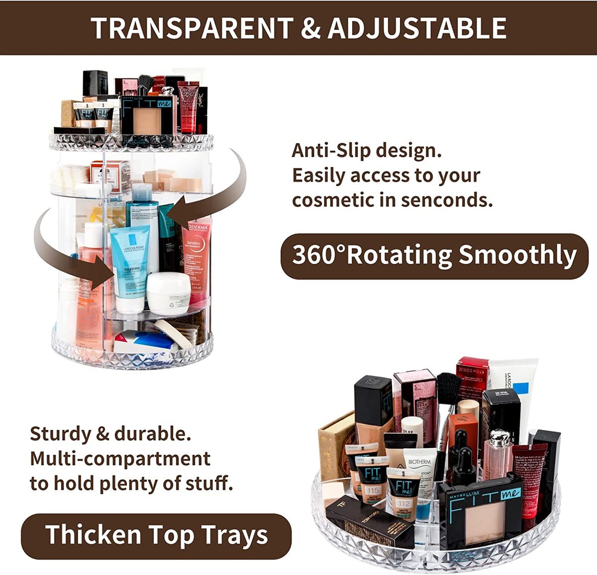 360 DEGREE ROTATING : helps you find cosmetics easily. Makeup organizer contains 4 trays, and its 7 adjustable layers can adjust to accommodate all your cosmetics in different sizes and heights. Reinforced steady base rotates smoothly and silently, easy access to all of your make-up in seconds.
