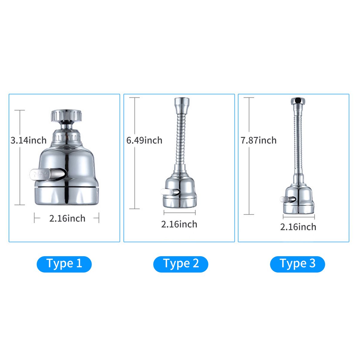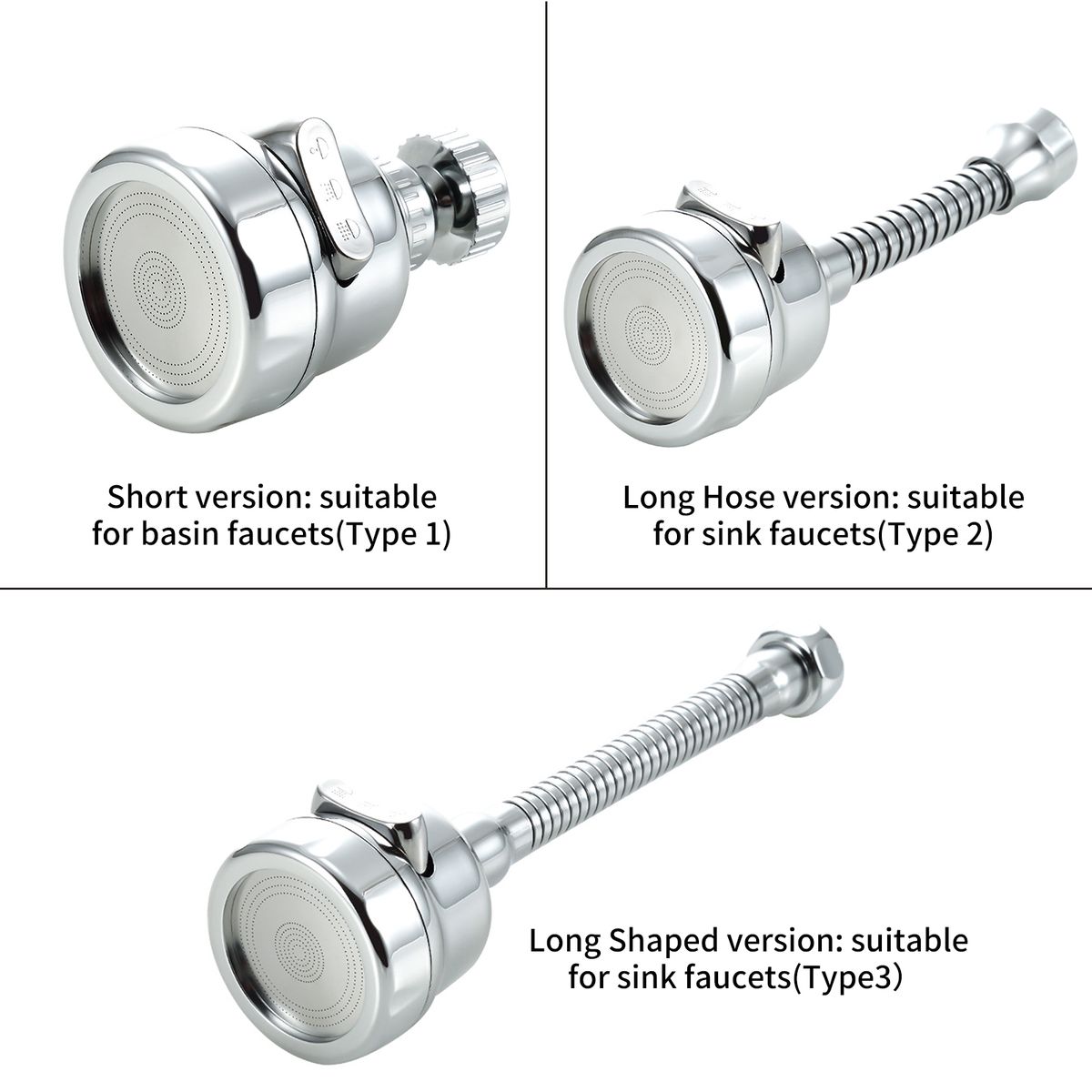 [360°Rotation]Type 1 & 2 water tap head with 360°rotation design, which is very flexible and convenient to use. Type 3 can shape after you adjust to any angle.