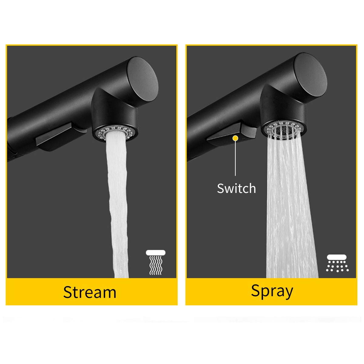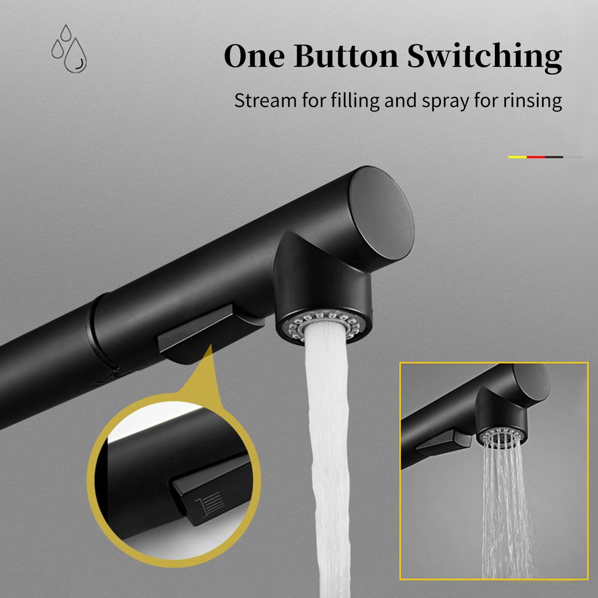 [Dual Spray Models]Switches between the regular stream and spray without turning off the water, stream for filling and spray for rinsing.