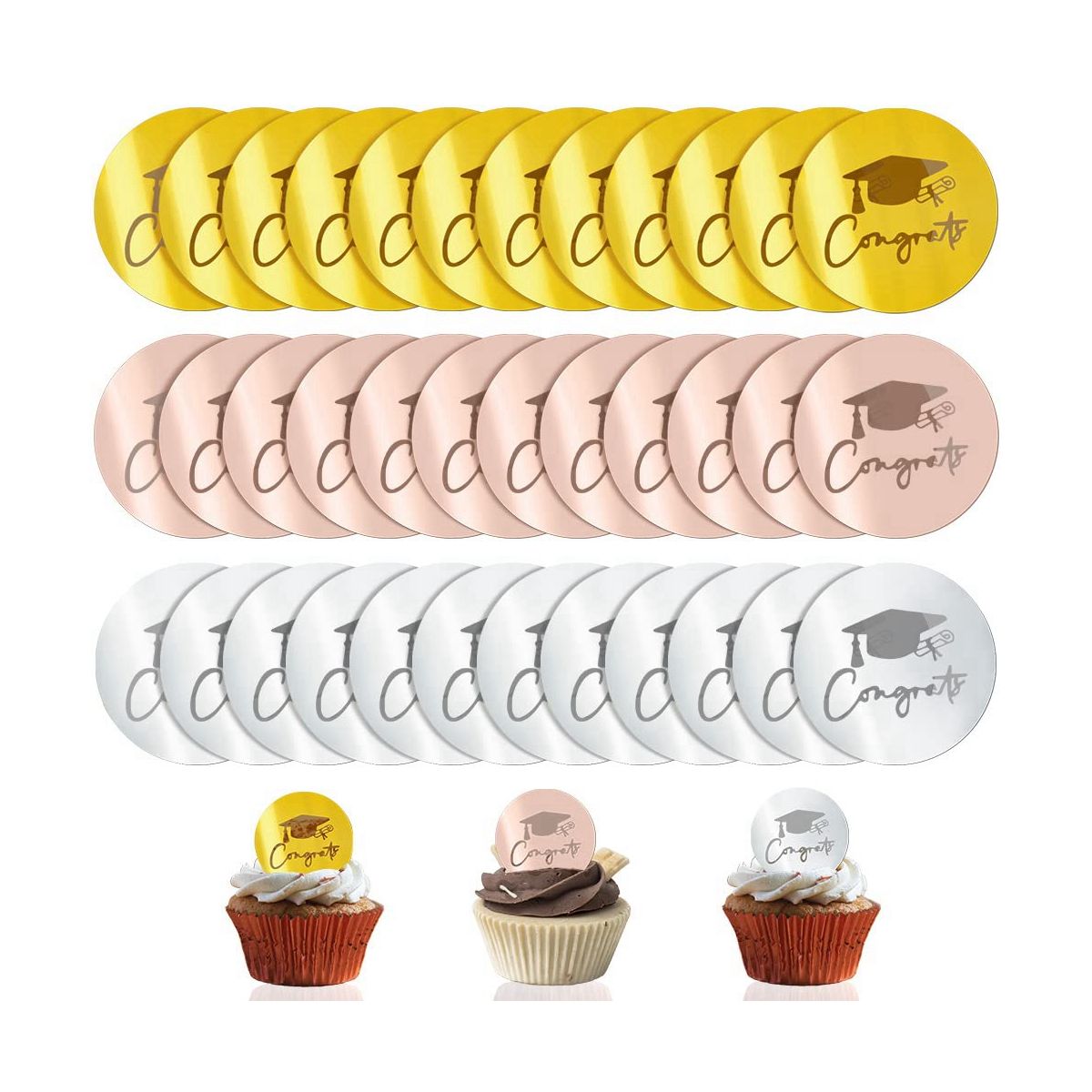 [Round Cupcake Toppers] We will you with 3 color (, gold, silver) cupcake toppers, 12 in one style; plenty of round cupcake toppers for your graduation party cakes or cupcakes Cake decorating request.