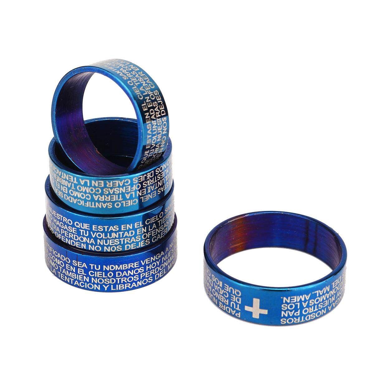 The Bible on the rings is in Spanish. The Bible is the Lord's Prayer.