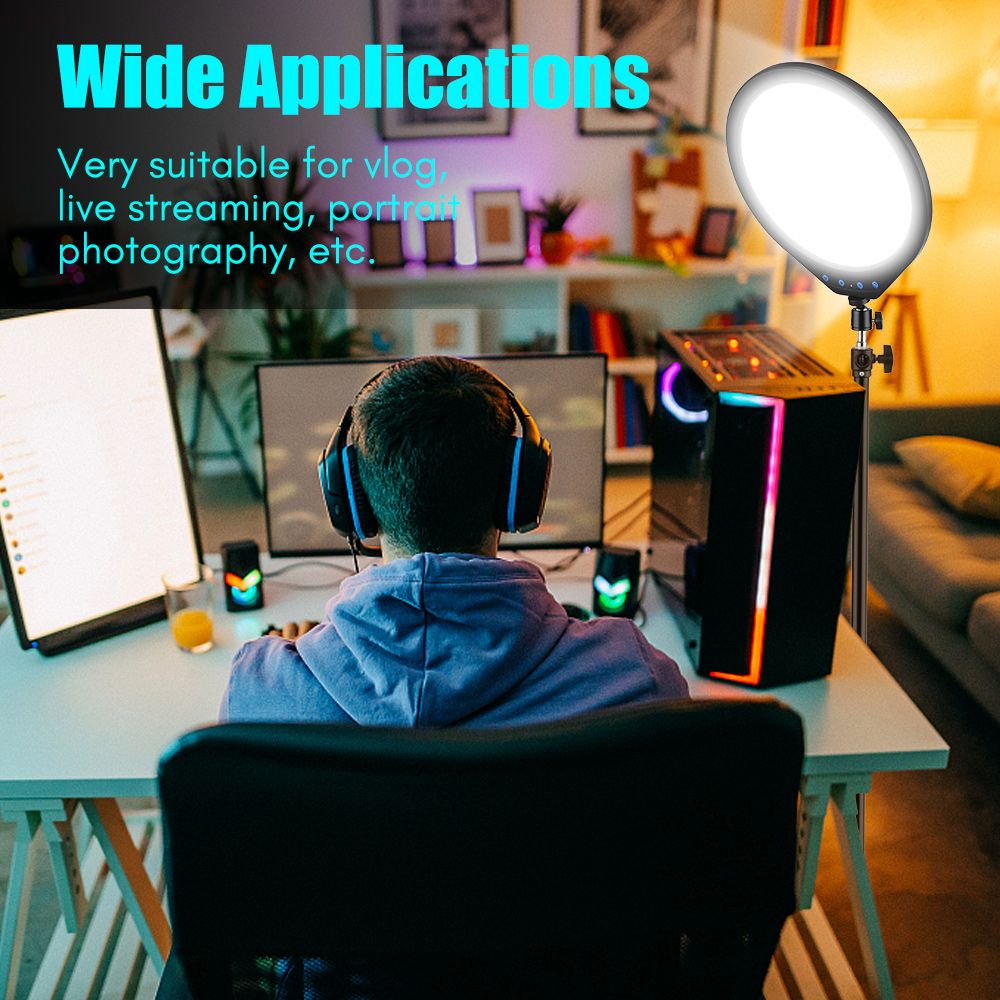 【Round Shaped LED Panel Light】Round shaped design, with large white panel to make the light more even and softer; adopts 224pcs high-quality LED beads, high brightness and 90+ high color rendering, very suitable for vlog, live streaming, portrait photography, etc.