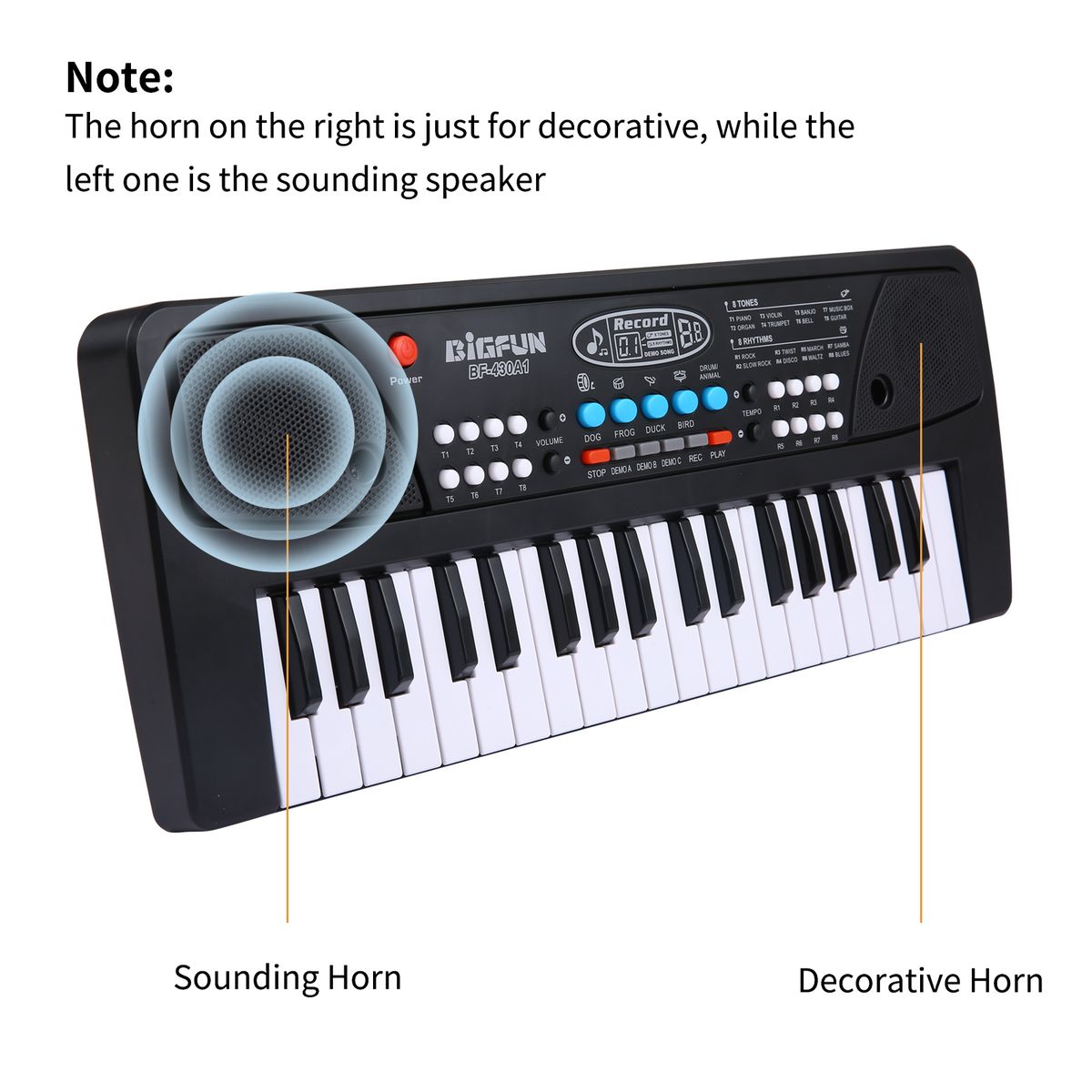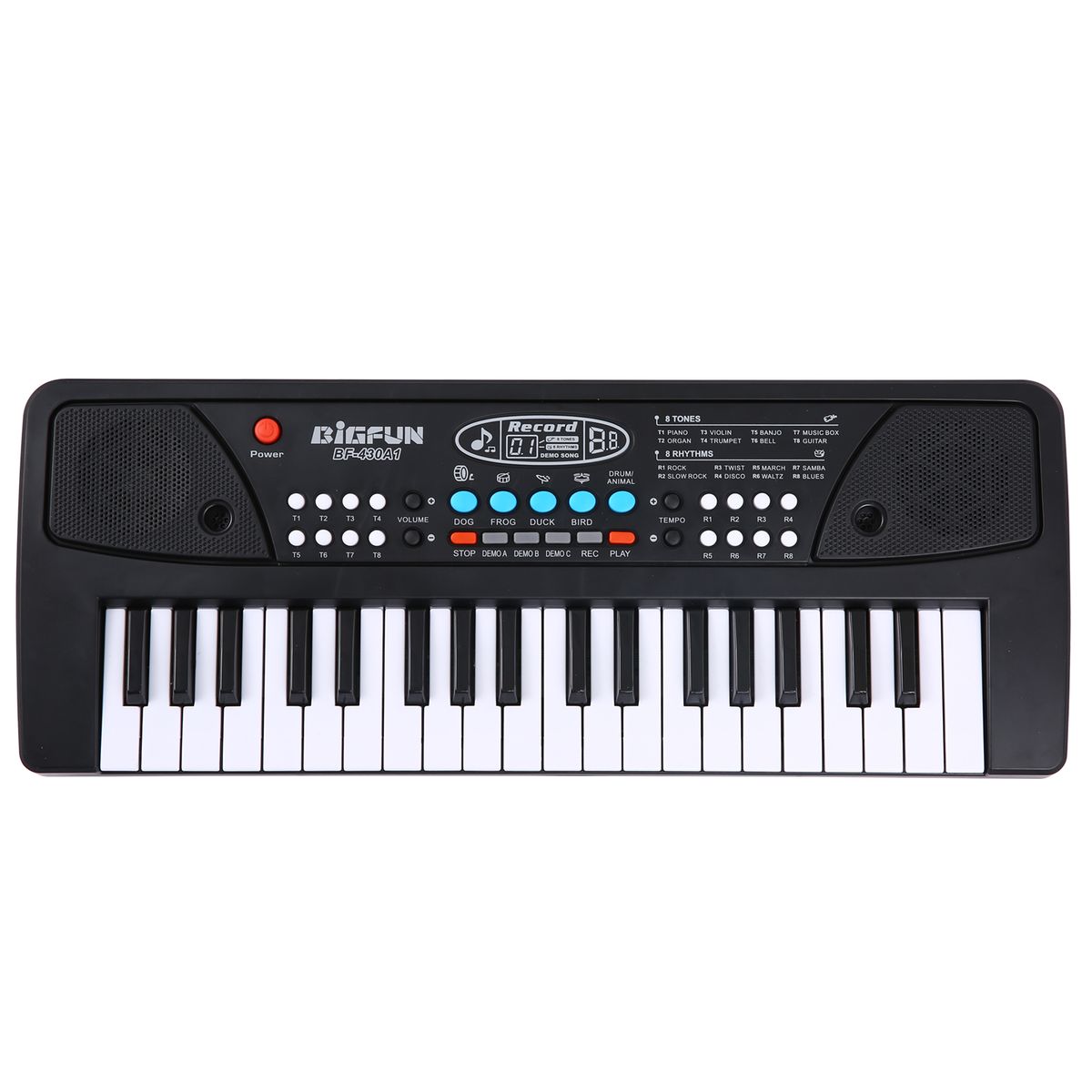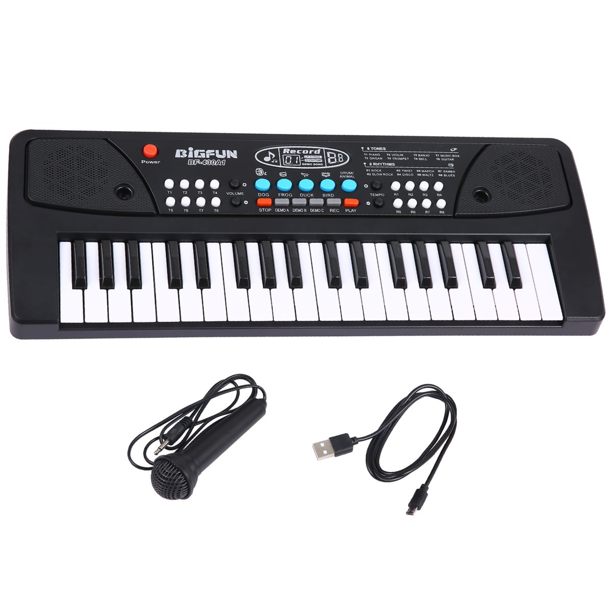 Multifunctional USB Electronic Organ: with a variety of built-in sounds and rhythms--8 tones, 8 rhythms, 6 demo songs, 4 percussion, it also has functions of volume control, tempo control, animal song effect, song record, and song play.