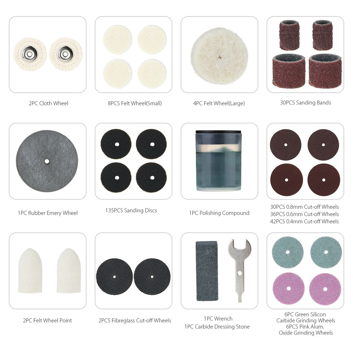378pcs Rotary Tool Accessories Kit - Includes polishing wax, drill bit, resin cutting disc, wool felt, felt polishing tip, resin cutting disc connecting rod, grinding needle, etc.
