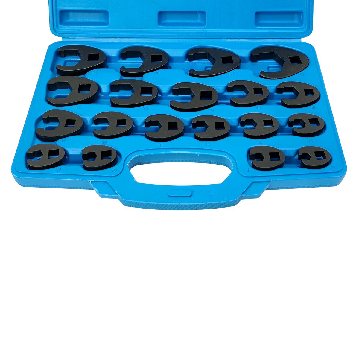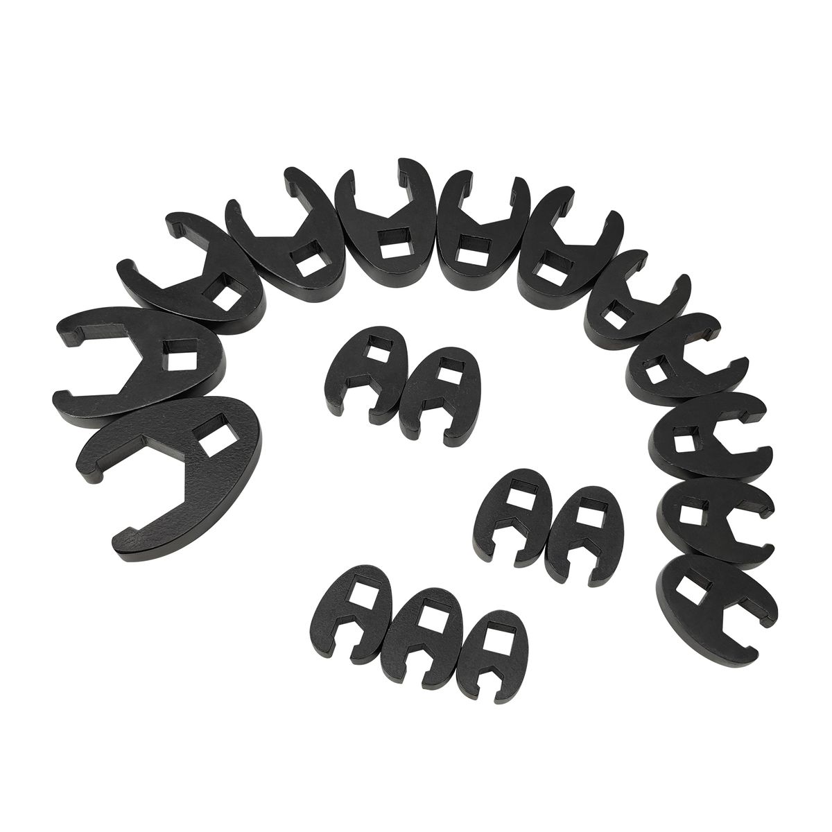 Crowsfoot wrench set includes 19 size metric crowfoot flare nut wrenches for 3/8 quot; and 1/2 quot; drive ratchet, extension or torque. 3/8 quot; drive 8mm, 9mm, 10mm, 11mm, 12mm, 13mm, 14mm, 15mm, 16mm, 17mm, 18mm, 19mm; 1/2 quot; drive 21mm, 22mm, 24mm, 27mm, 28mm, 30mm, 32mm.