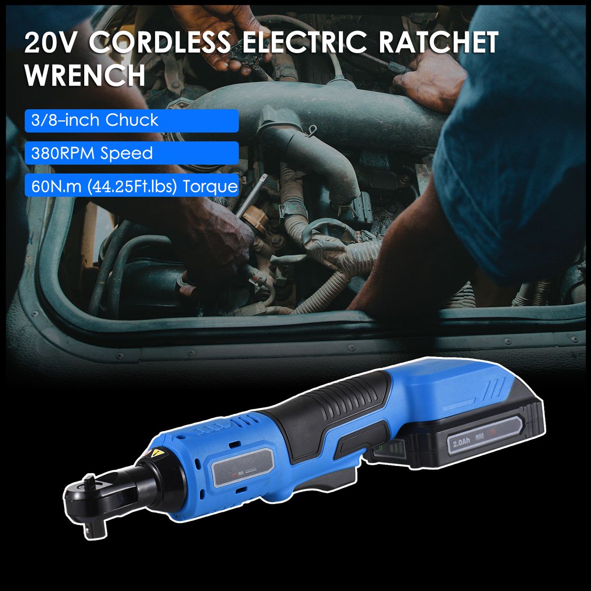 20V electric ratchet wrench, with 0-380rpm speed adjustment and forward/ reverse button, is suitable for tightening/ loosening nuts and bolts. The power tool is more efficient and more labor-saving than manual ratchet wrench.