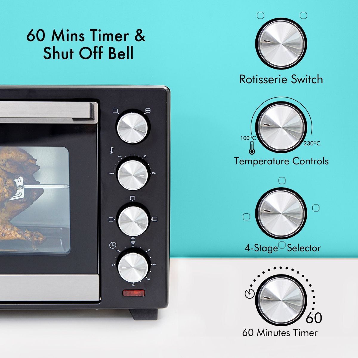 2 YEAR WARRANTY, ACCESSORIES INCLUDED - The set of electric oven includes all the accessories you need to guarantee the finest results, 1 x bake/food tray, 1 x grill bake tray/wire rack, 1 x tray handle, 1 x rotisserie fork, and 1 x rotisserie handle. All these accessories are easy to install, remove and wash.