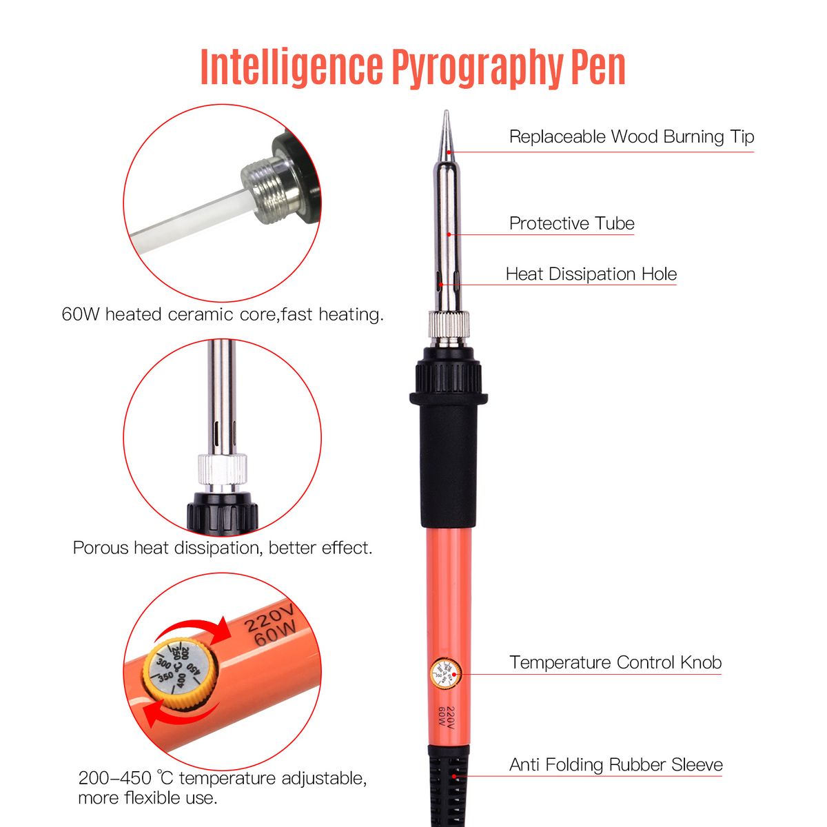 Humanized Design: The pyrograph pen body is ergonomically designed, comfortable to hold and easy to operate. More cooling holes, faster heat dissipation, avoid burning iron core.