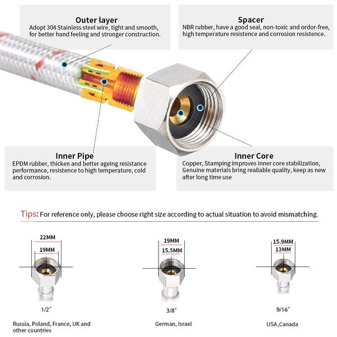 The faucets hoses are made of scratch and tarnish-resistant stainless steel can keep a lifetime of beauty, it is also easy to wipe clean in daily use. Double ring sealing washer, not leaks, ensuring quality and longevity. Fit perfectly for bathroom, toilet, washbasin, water heater, base faucet of hot & cold water supply.