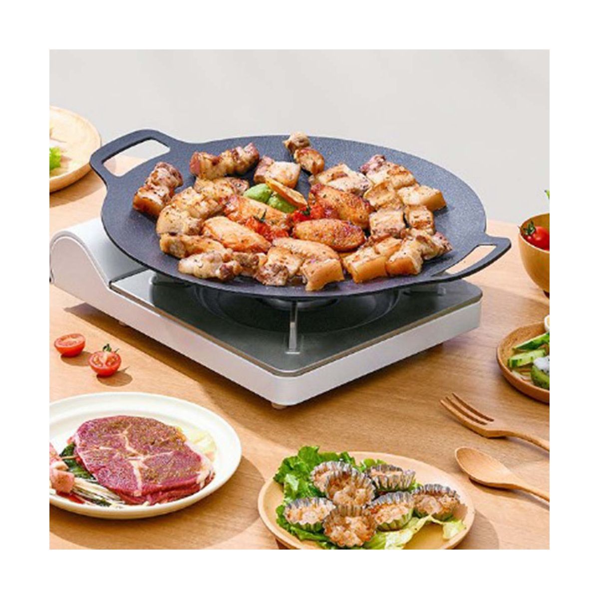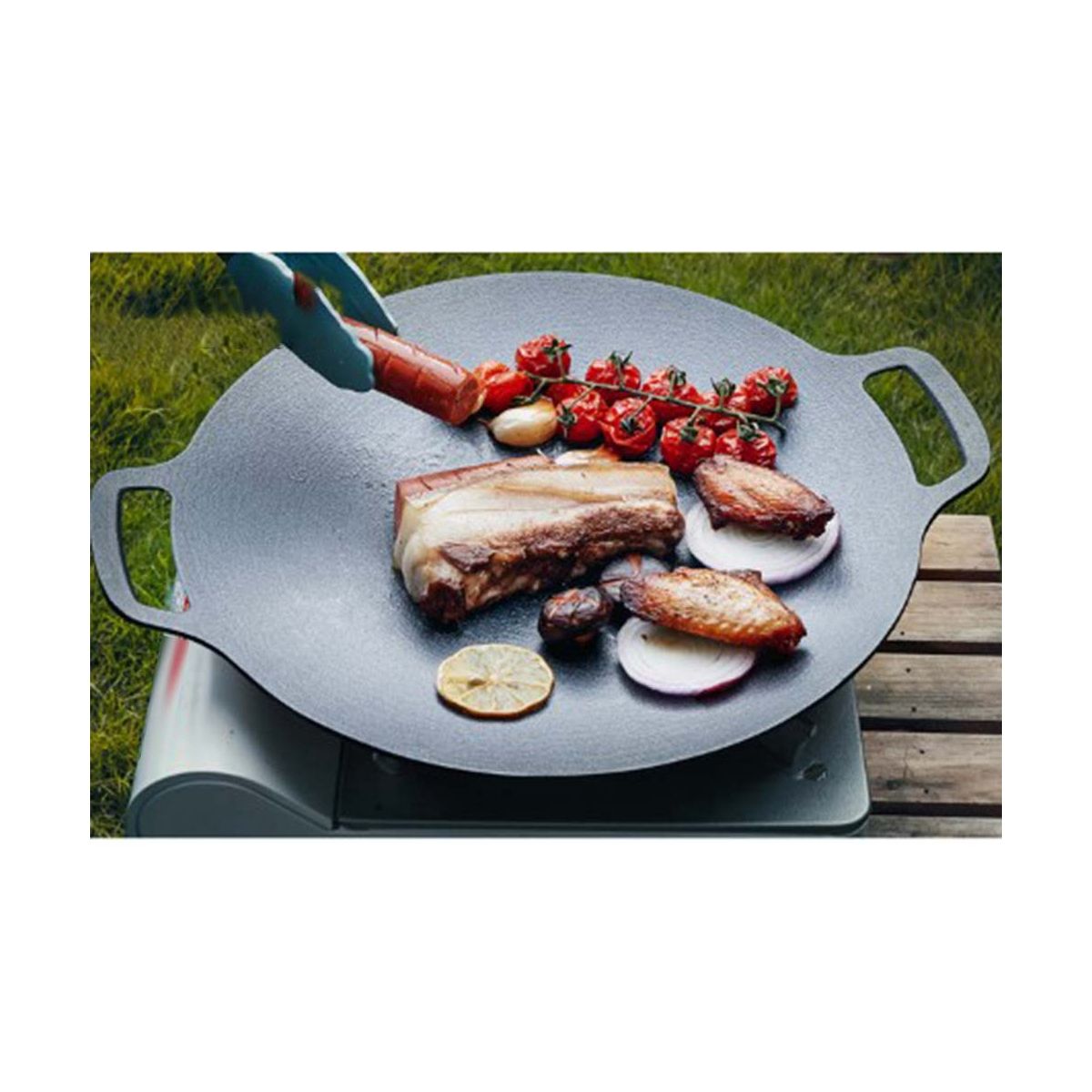 Versatile barbecue, barbecue, fried meat, flapjack, fried noodles. The product is light lampblack, fast frying, physical non-stick, multi- in one pot, non-stick easy cleaning, high outside and low inside design, uniform heating, necessary in the kitchen