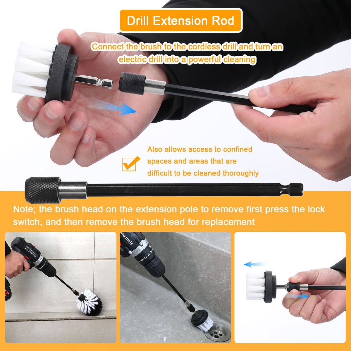 Drill Extension Rod: Connect the brush to the cordless drill and turn an electric drill into a powerful cleaning tool in seconds to get deep cleaning jobs done faster and save more time. Also allows access to confined spaces and areas that are difficult to be cleaned thoroughly.