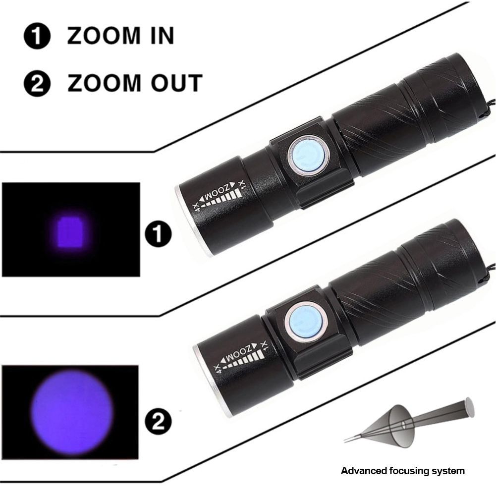 395Nm UV Light Flashlight Blacklight USB Rechargeable[FOCUS ADJUSTABLE & WITH HIGH QUALITY DESIGN ]Zoom in/ out to adjust suitable light range. Enlarge the beam to circle the suspected area and narrow down to mark the pet's urine. The body is made