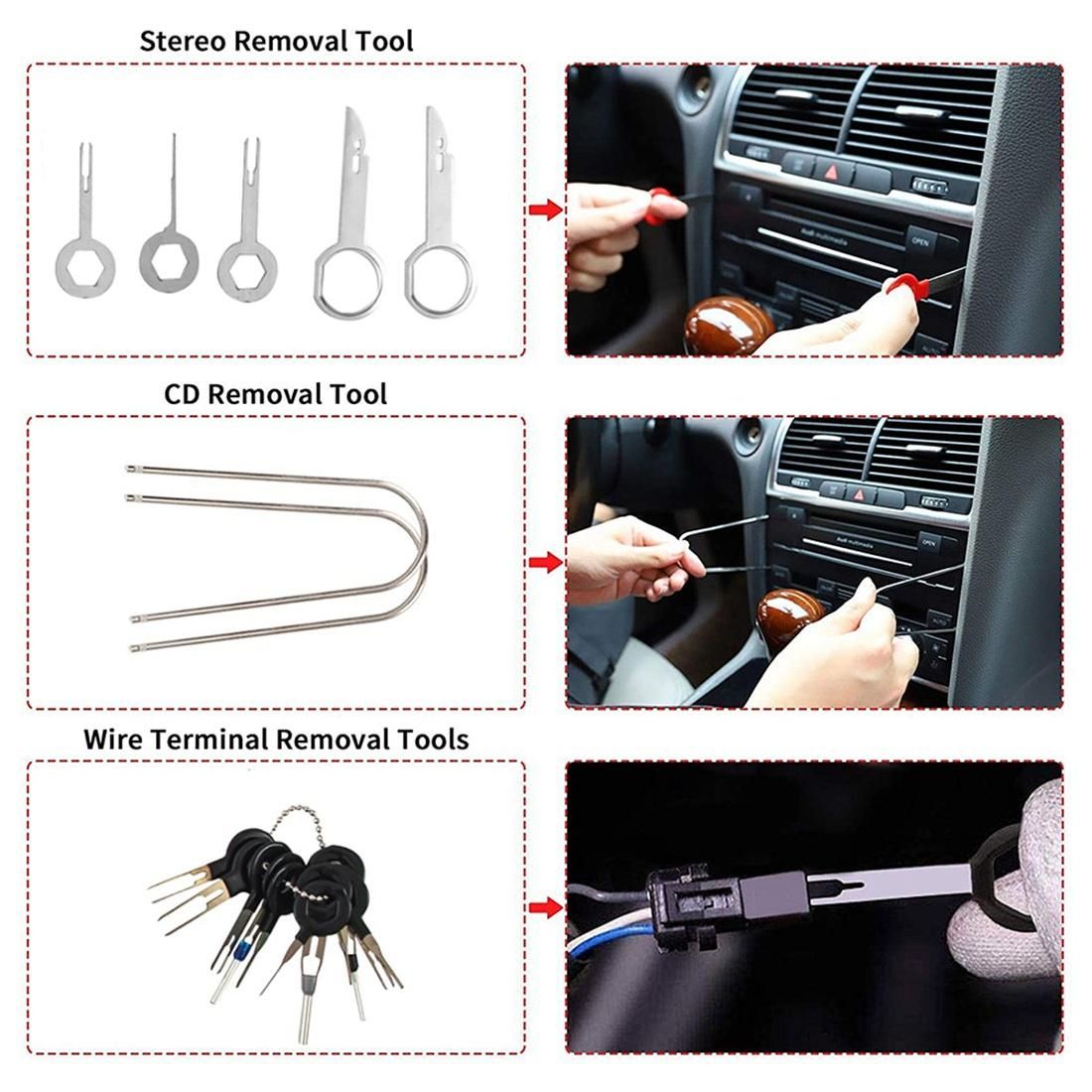 [Package Included]11 Pieces Trim Removal Tools, 1 Piece Trim Clip Removal Pliers, 2 Pieces Upholstery Fastener Removers, 4 Pieces Precision Hook Picks, 8 Pieces Stainless Steel Stereo Removal Tools, 11 Pieces Stainless Steel Auto Terminal Removal Key Tools, 1 cable threader, 1 fastening device and a portable storage bag.