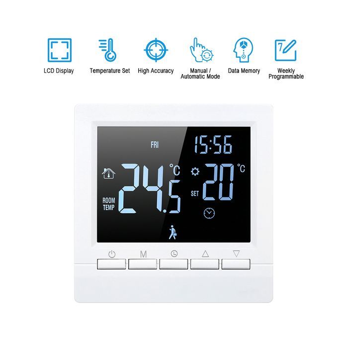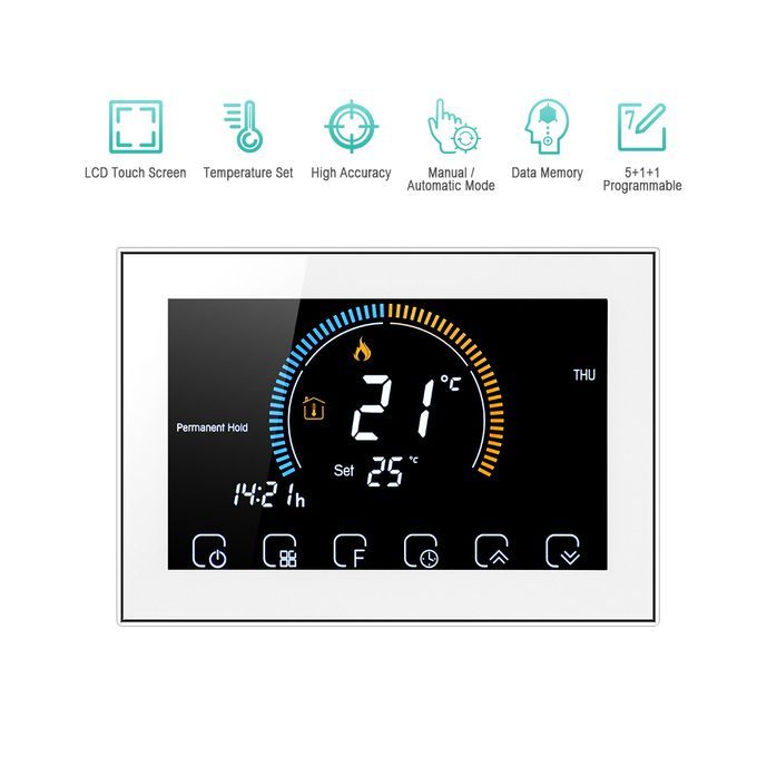 This is a durable, safe and reliable water heating thermostat that is easy to install and program. Exquisite appearance, simple and super thin design, very fashionable. It will provide uniform and comfortable temperature control throughout every room in your property. Also it conveniently fits in with your lifestyle and provides you an energy-saving and comfortable living environment. It can be used in industry, commerce, hospital, hotel, civil buildings and villas for heating control.