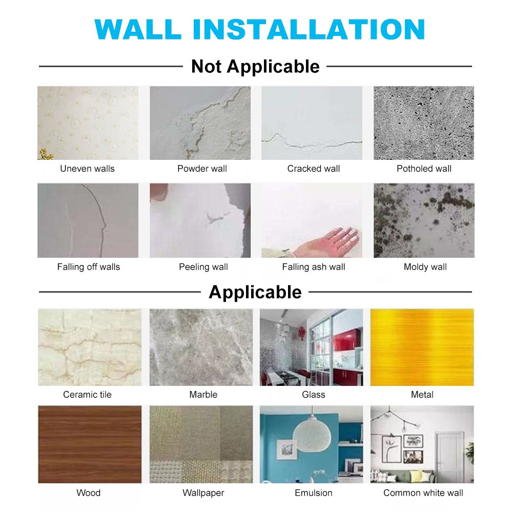 [APPLICABLE & NOT APPLICABLE WALL] Ceramic tile, marble, glass, metal, wood. wallpaper, emulsion and common white wall are applicable to install. Uneven walls, wall, cracked wall, potholed wall, falling off walls, peeling wall, falling ash wall and moldy wall are not applicable.