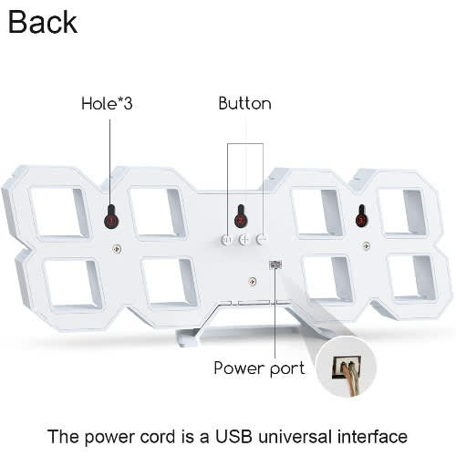 Package Included: 1 x Multi-Function Large 3D LED Digital Wall Clock Alarm Clock 1 x 1M USB Cable 1 x Full Manual 1 x Battery 1