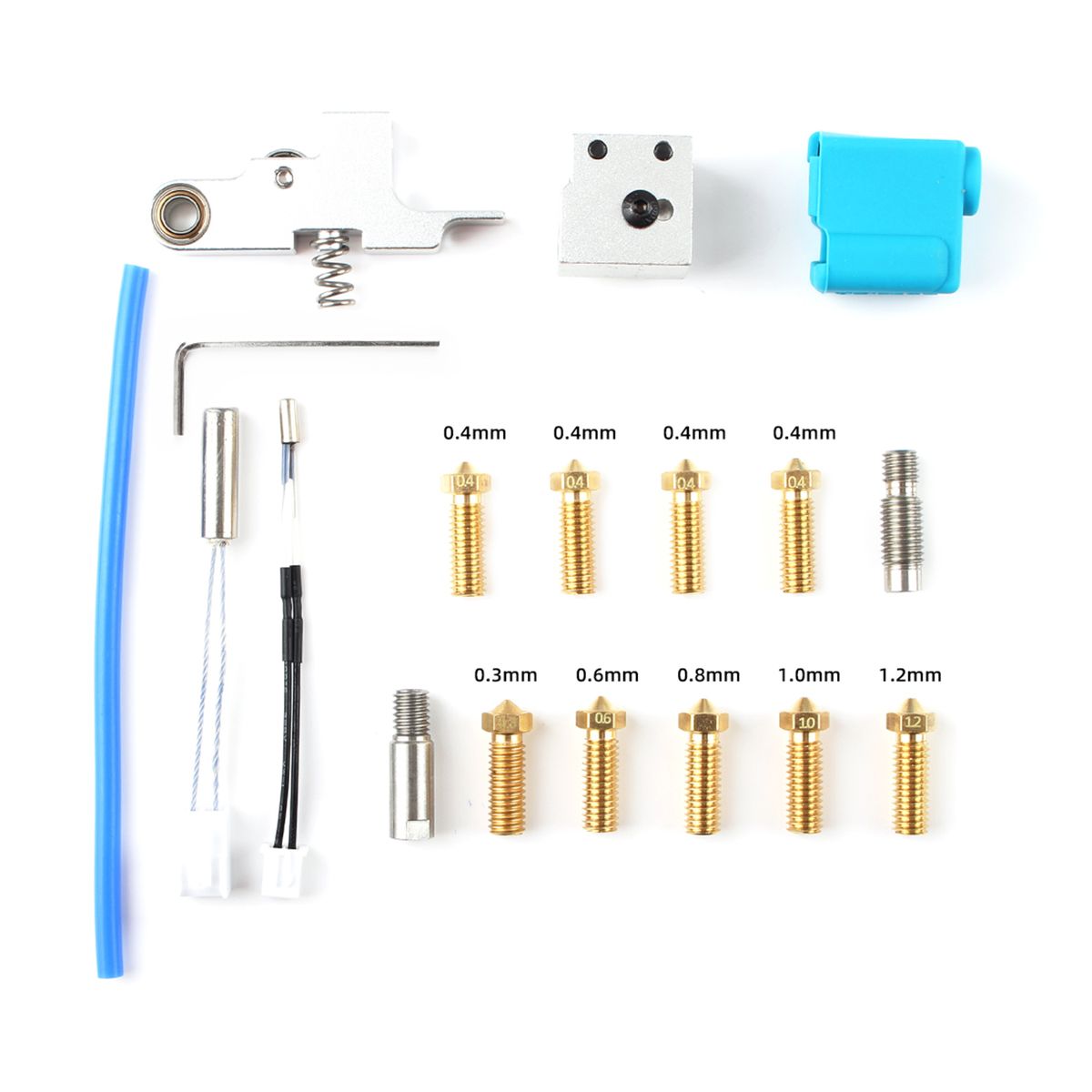 Delivery includes 9 x nozzle, 2 x throat tube, 1 x heating tube, 1 x thermistor, 1 x PTFE tube, 1 x extruder idler arm, 1 x heater block, 1 x silicone cover, 1 x hex wrench.
