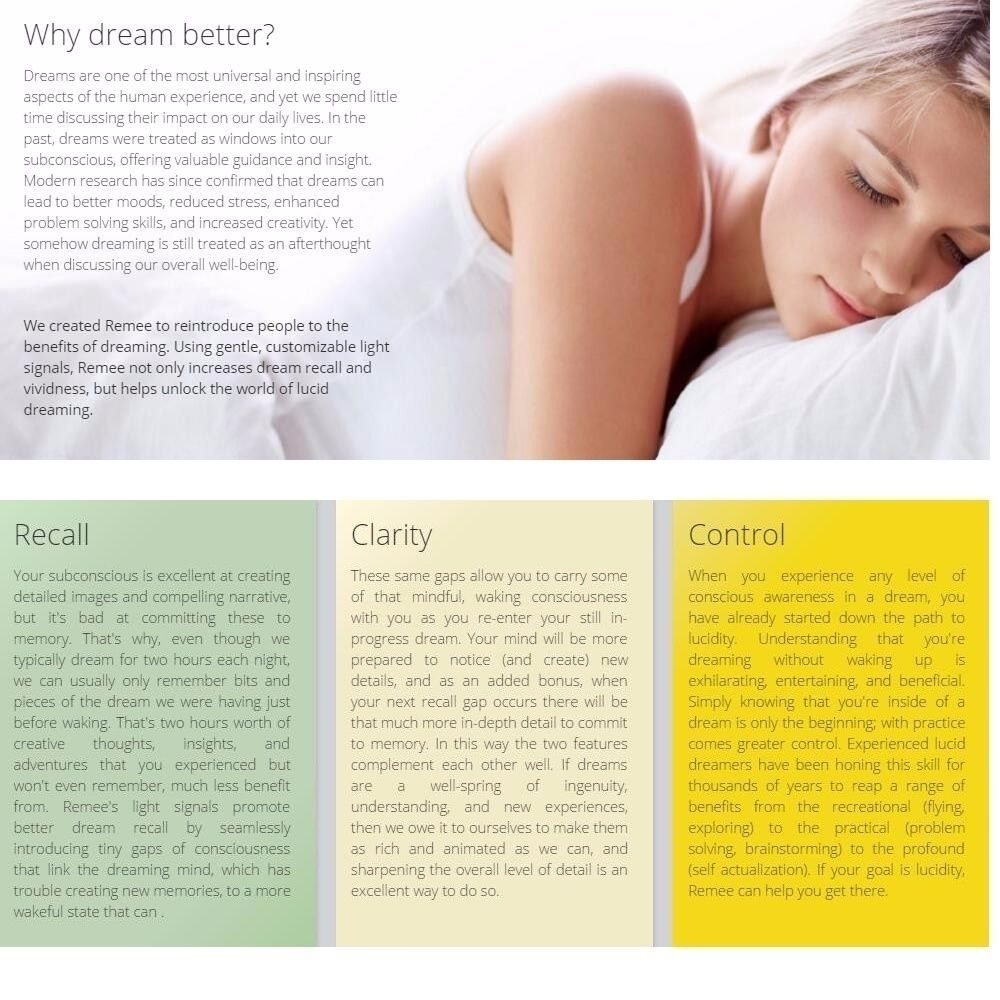 - 1. Night lights Remee's rear-facing LEDs serve as your touchstone to the waking world. Using a series of smart timers, light patterns are displayed throughout the night, targeting your REM cycles where dreams most often occur. The patterns can be as gentle or as jarring, as bright or as dim, and as fast or slow as you like. The more time you've spent tuning your light patterns the better success you'll have improving recall & clarity, and the closer you'll be to lucidity!