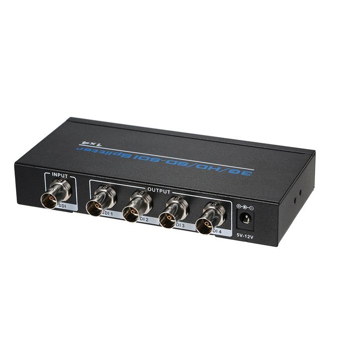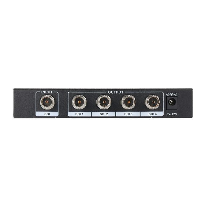 1 * 4 Splitter distributes allows 1 SDI, HD-SDI, 3G-SDI video source to 4 SDI/HD-SDI/3G-HDI displays simultaneously. This product built-in automatic identification and compatible with SD-SDI, HD-SDI, 3G-SDI all format of SDI signal.