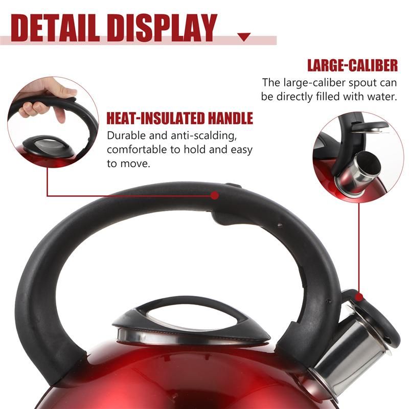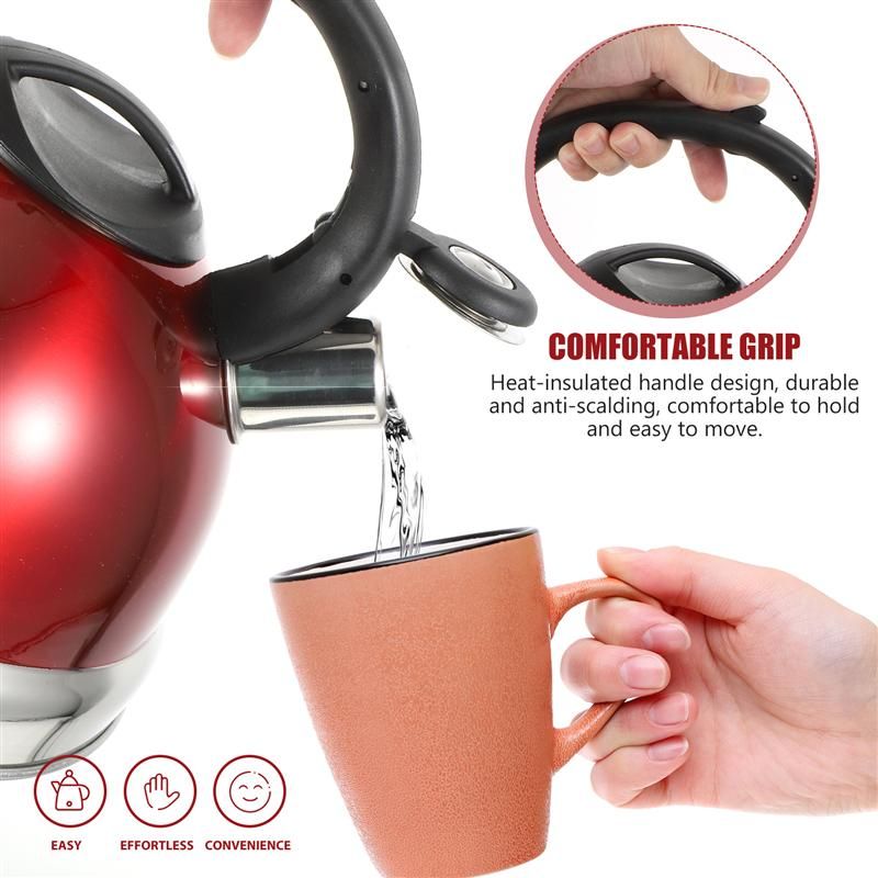 Description This item is a whistling water kettle manufactured with premium stainle steel material, so it can serve you for a long time. Fine craftsmanship ensures its durability and practicability. It is perfect for you to heat water, which boils water very quickly, reducing waiting time. Features -Color: Red -Material: Stainle Steel and Nylon -Size: About 22.00X22.00X22.00cm/8.65X8.65X8.65in - Heat-insulated handle design, durable and anti-scalding, comfortable to hold and easy to move. - The water boils and the whistle is automatically sounded, which can remind you that the water is boiling, which is safer and more reliable. - The large-caliber spout can be directly filled with water, which is time-saving, fast, safe and sanitary. - Made of high-quality stainle steel and nylon materials, it is safe and durable, and can be used with confidence. - The bottom has good heat resistance and long service life, suitable for induction cookers, gas stoves, etc. Packing list