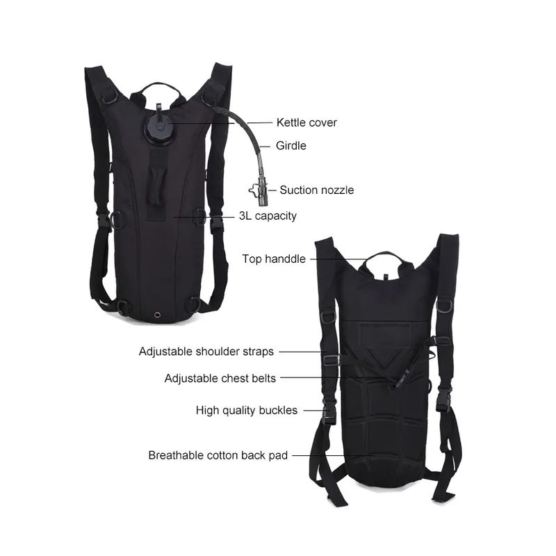 Product Feature:Satisfy Your Thirst For Adventure: This lightweight and comfortable hydration backpack is a terrific companion to keep you hydrated while running, cycling, hiking or any adventure outdoors. And this pack comes with a pouch on the back to store your phone and essentials3L Hydration Bladder: BPA-Free, taste-free, and odorless. Durable, kink-free sip tube and push-lock cushioned bite valve, gently biting the valve to open up the flow of water; Large 2 opening for ice cube and easy cleaningTrusted Quality: Hydration Pack made rugged Oxford fabric and nylon lining, resistant to tears and abrasion. Durable plastic insert buckles with ultra-high hardnessLightweight & Comfortable: Weighs only 0.4kg with adjustable shoulder straps, The ergonomic design makes your back more comfortable. The soft, breathable mesh pad on the back keeps your back cool and dry