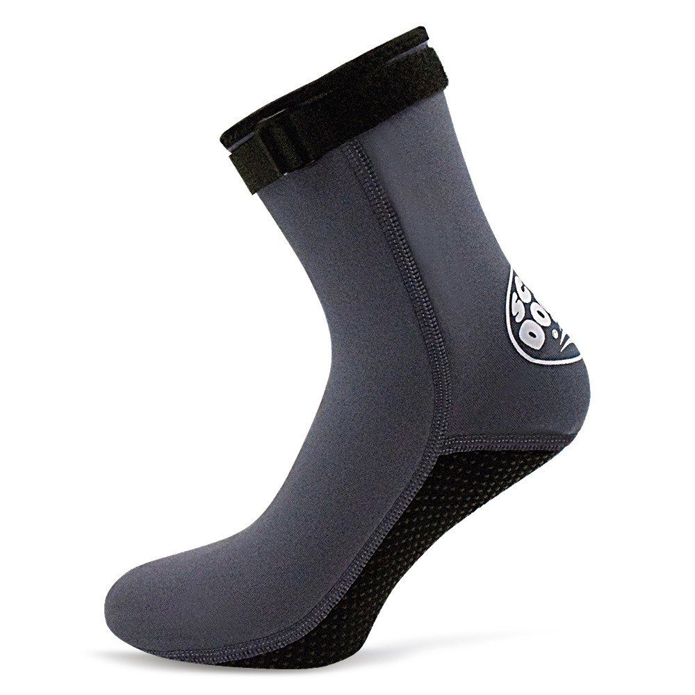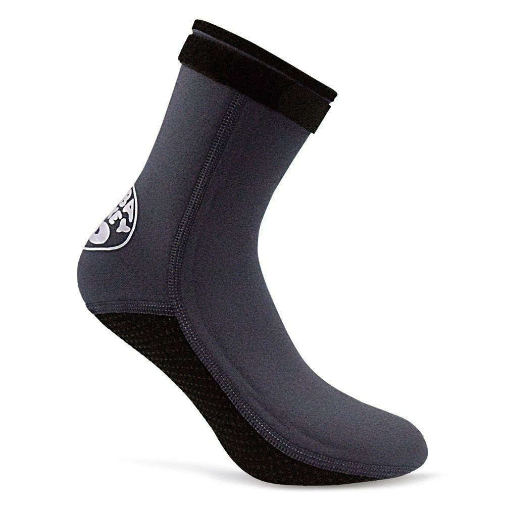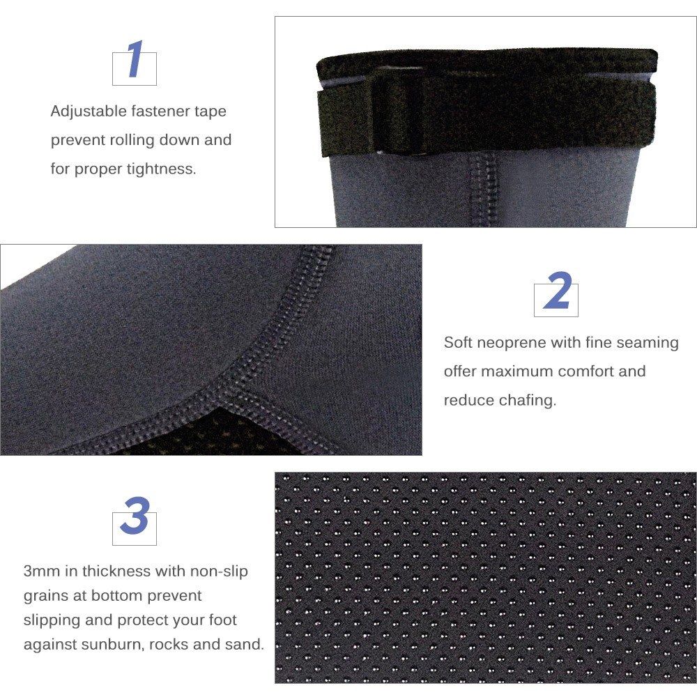 Anti-skid grains at bottom increase friction prevent slipping. 3mm superior neoprene with fine seaming protect your foot from stones or rocks while keep foot warm in water, and elastic cuff with fastener tape prevent the socks rolling down during water sports, great beach booties for men and women.