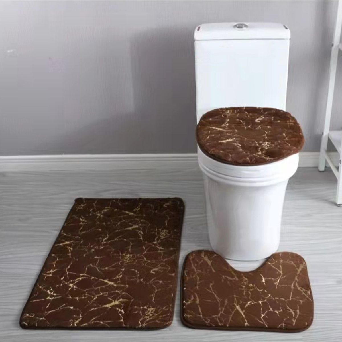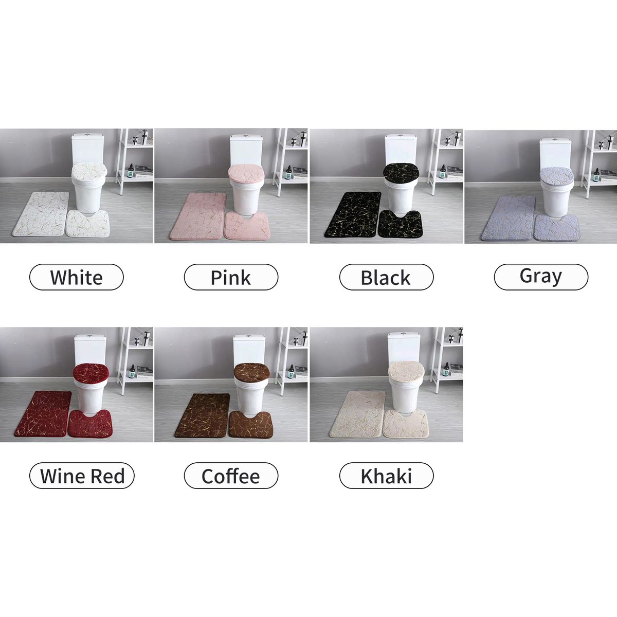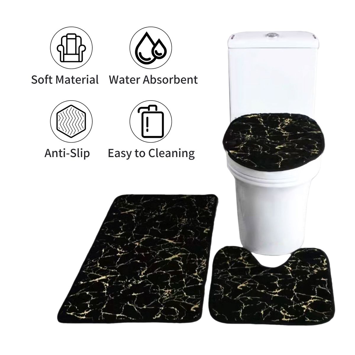 The bath mat, toilet lid cover, and U-shaped rug set have strong absorb water ability, the water will be absorbed in a short time. Widely used as bath mats for bathrooms, bathtub mats, bathroom rugs, doormat, bedroom rugs, dog bath mats, and foot bath mats.