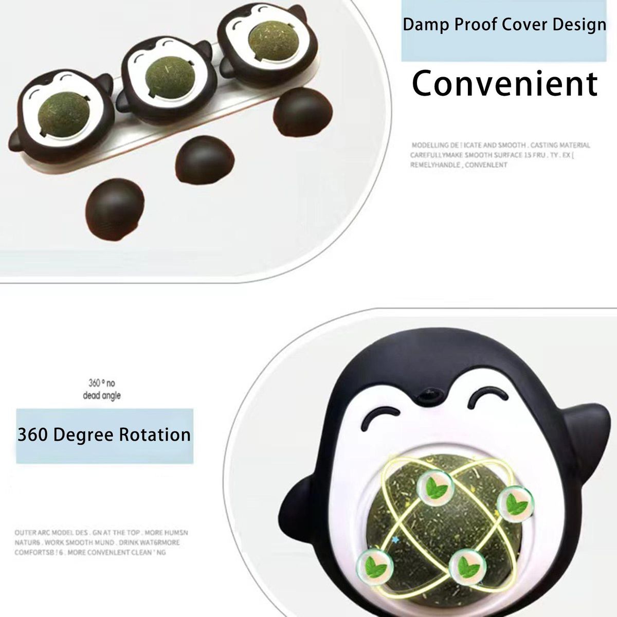 Designed to look like a penguin, this cat toy is cute and sophisticated. It comes with a transparent cover that is moisture and dust resistant. The balls can be rotated 360 degrees for your cat to bite.