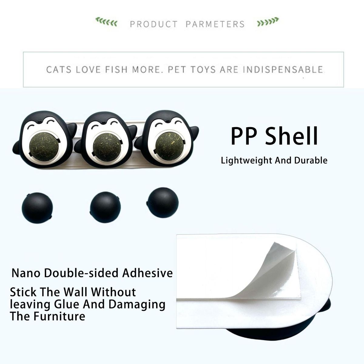 A cat toy that is self-adhesive and can be attached to the wall or other surfaces. They not only clean your cat's mouth and teeth, but also promote the intestinal system, expel hairballs, enhance appetite and delight your cat.