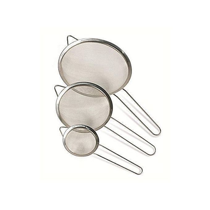deliver superior straining result. A great and indespensable kitchen utensil. Perfect for straining both wet and dry ingredients. This is a quality stainless steel mesh that is also very durable. Comes with long handles for convenience when straining ingredients. This stainless steel mesh comes in three different sizes for different straining needs; and for straining both small and large quantity of food ingredients. Aids easy and fast meal preparation.