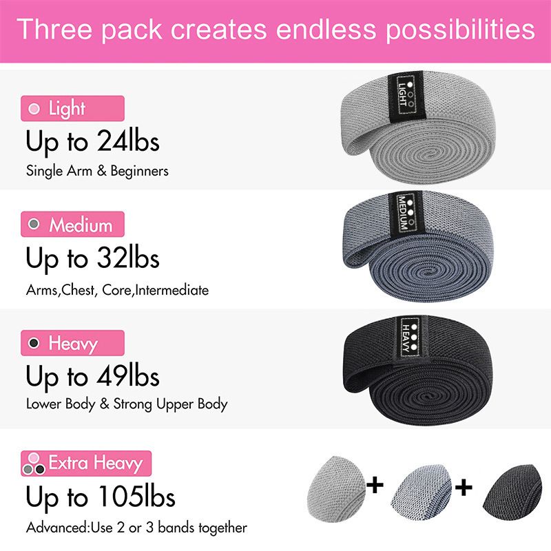 - ★【Suitable for Many Exercise】- Exercise bands are ideal for assisting in P90x, CrossFit, Yoga, Insanity, Pilates, Hot Yoga, and Beach Body workouts. Soft fabric resistance bands will NOT slide or roll up during workouts,the best choice for sports and fitness.