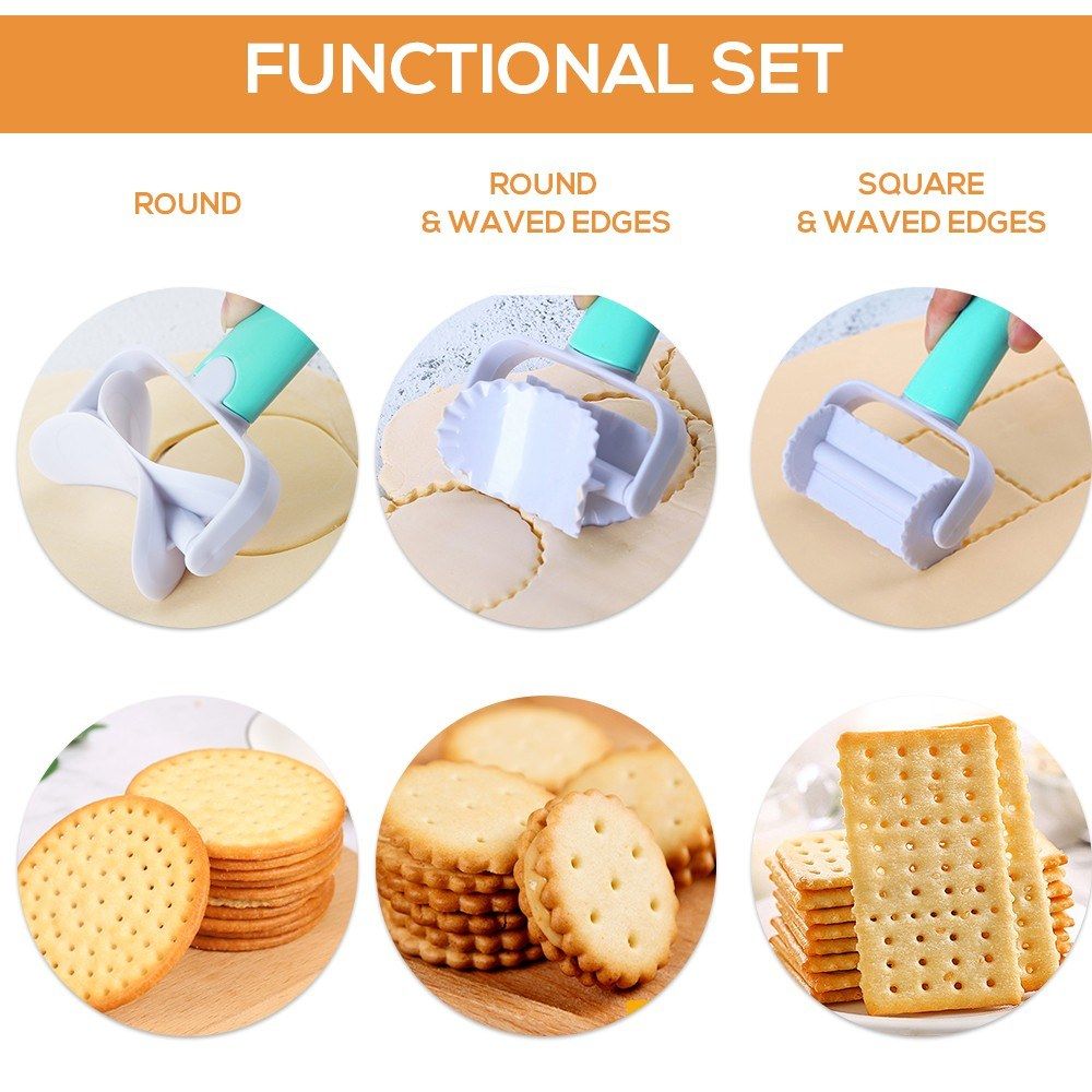 Our 3pcs rolling biscuit cutters set encompasses a round cutter, round cutter with waved edges, square cutter with waved edges. They are all made from eco-friendly and food grade plastic, which work perfectly for cutting out it to the perfect-size biscuits. It is super easy to use, even beginners could gain a excellent biscuit result. Just make cookies with your friends or families together and enjoy the fun of DIY.