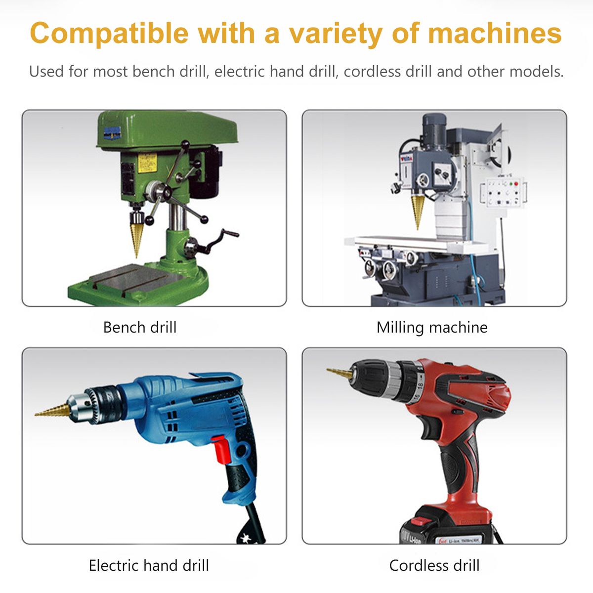 Compatible with a variety of machines, used for most bench drills, electric hand drill, cordless drill, and other models. Different specifications step drills can meet different drilling requirements.